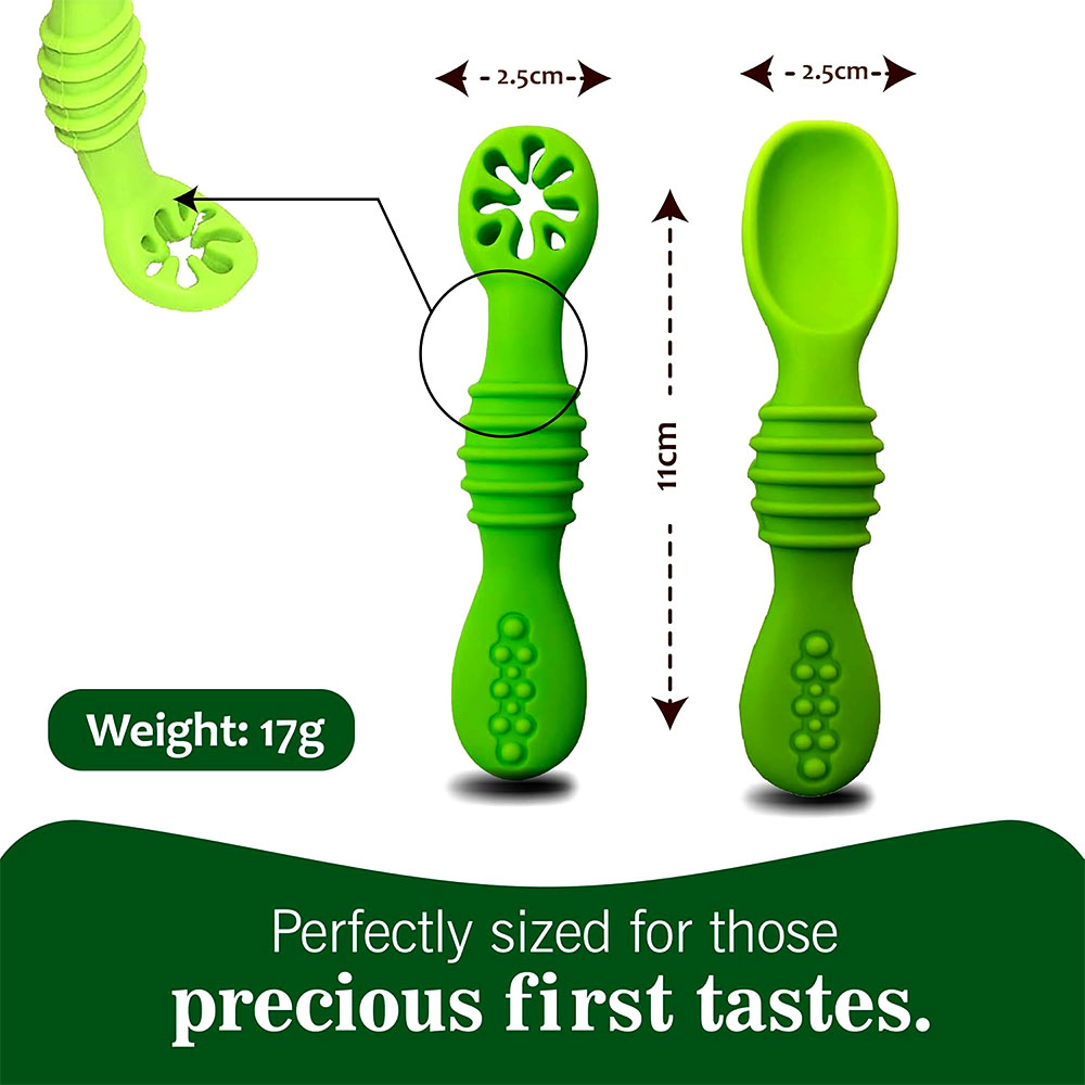 The chic buddy baby first stage spoon in green is a specialized feeding utensil designed specifically for introducing infants to purees and solid foods. It features a soft, safety-focused design to protect the baby’s gums and is ergonomically shaped for both parents’ comfortable feeding and a baby’s first attempts at self-feeding.