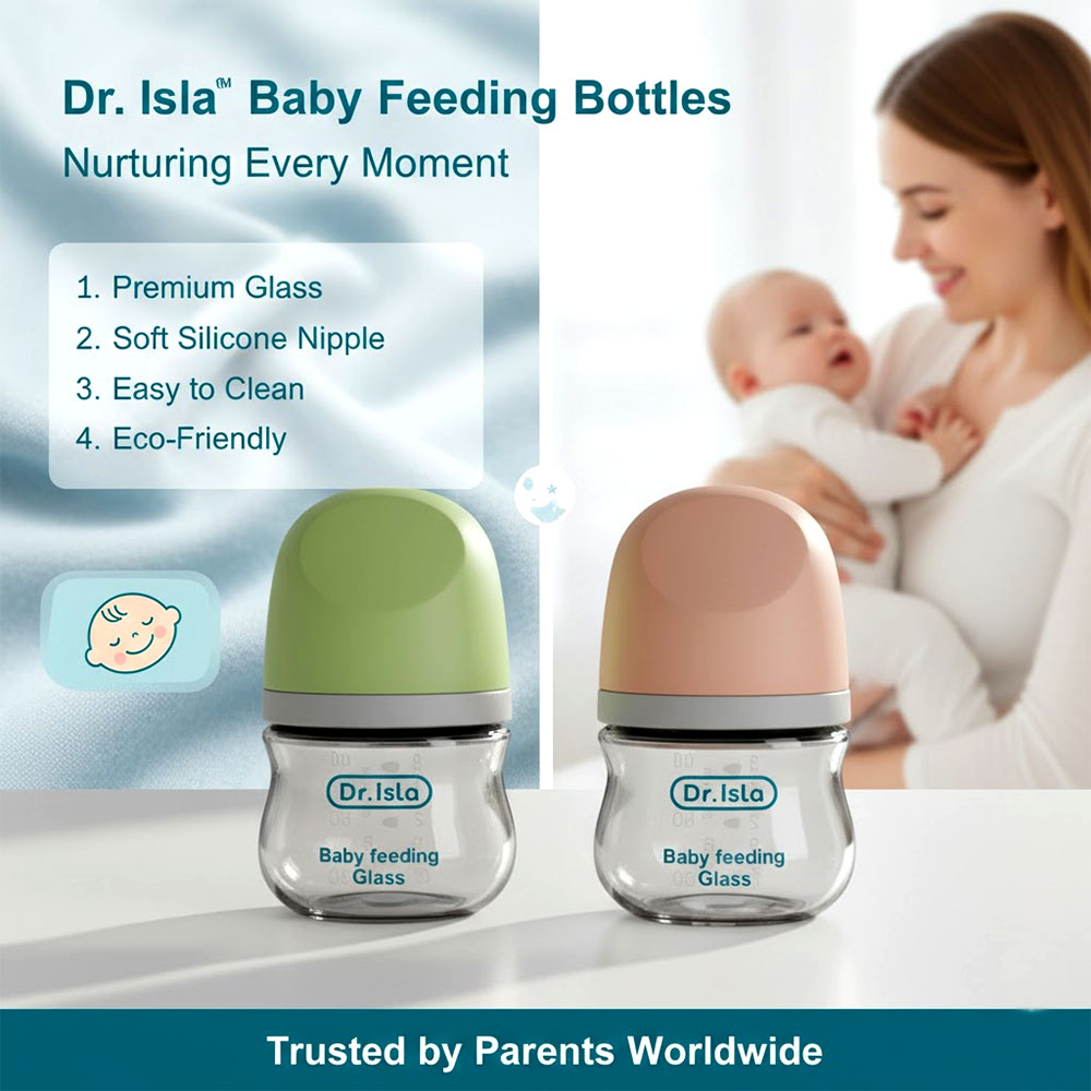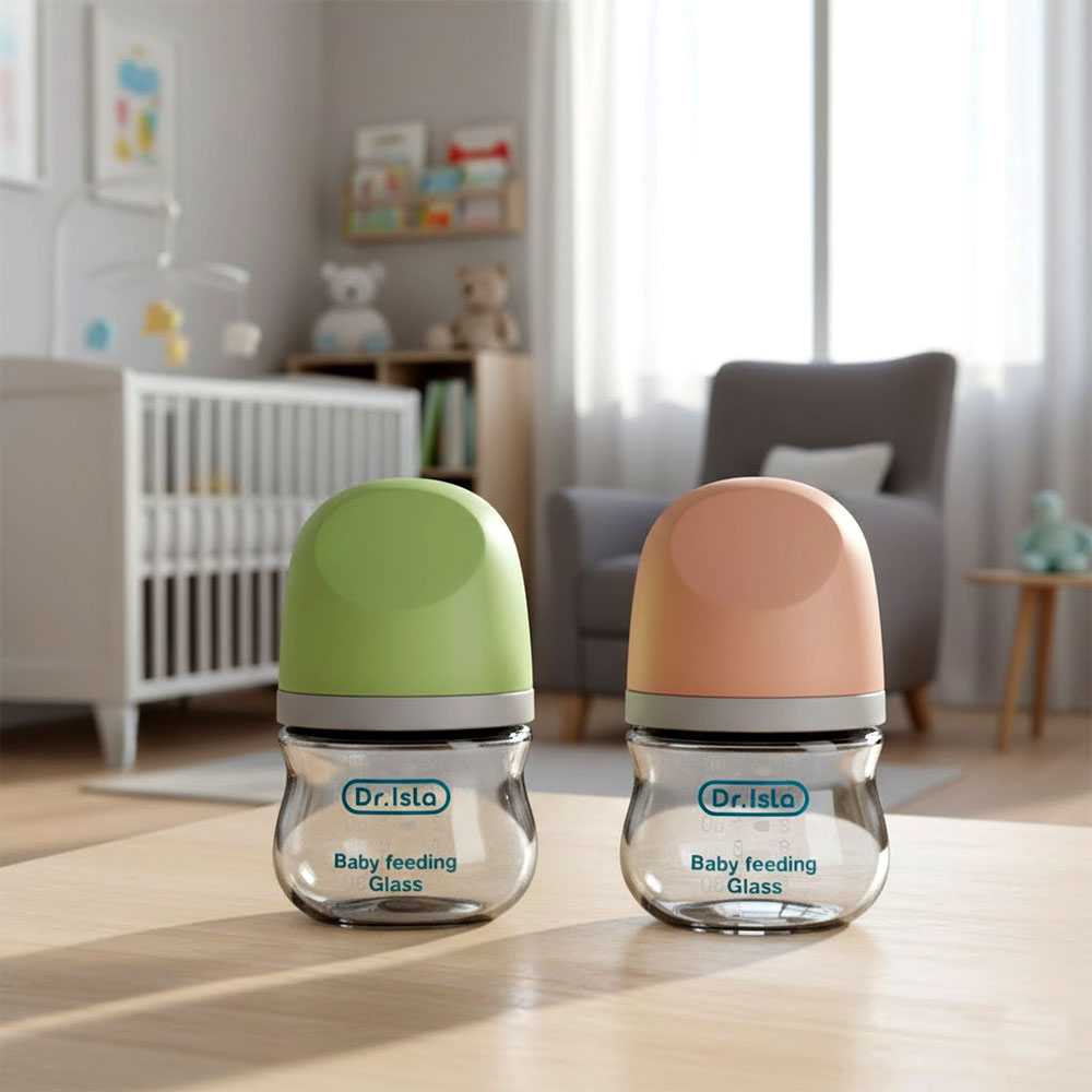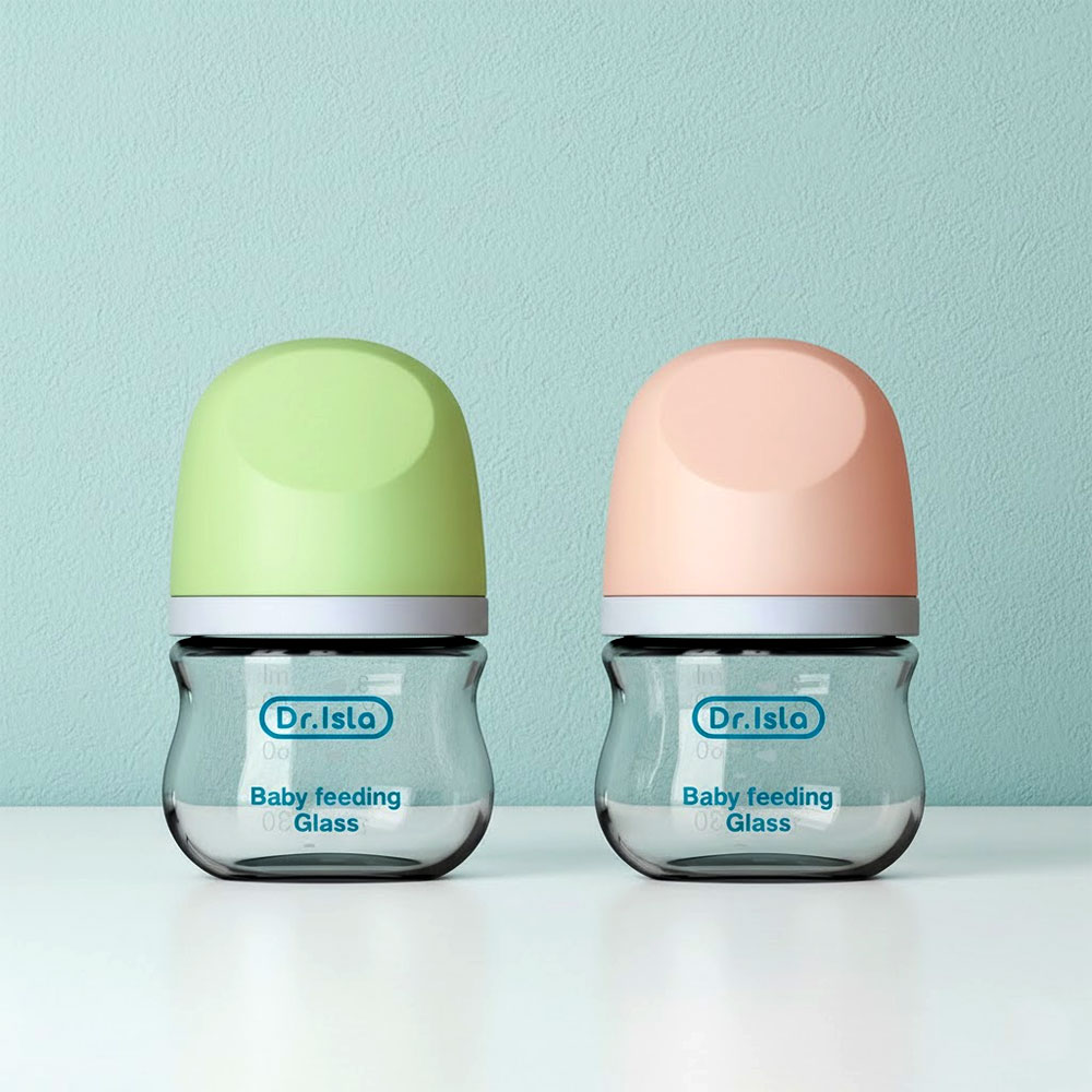 The dr. Isla 90 ml baby glass bottle is designed for newborns and young infants, focusing on safety, comfort, and ease of use. It is typically available in both pink and green color options.