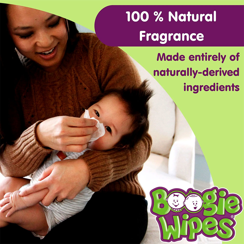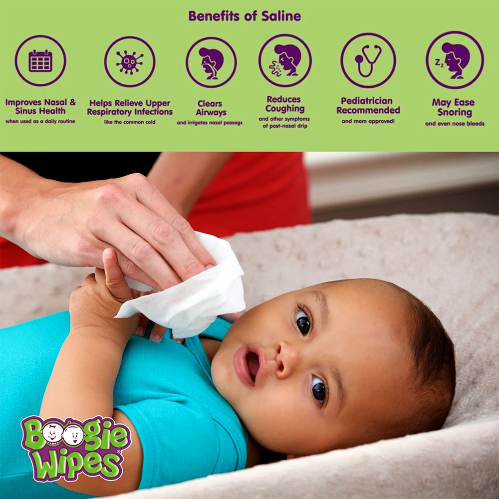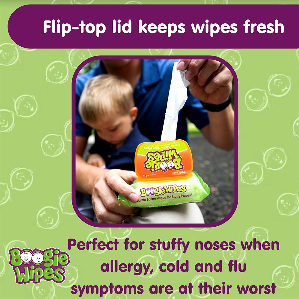 Boogie wipes saline nose wipes are soft, pre-moistened wipes designed as a gentle and effective alternative to dry tissues for cleaning irritated noses, especially in children and babies. They are infused with natural saline to dissolve dried snot and boogers while moisturizing the skin with ingredients like vitamin e and aloe, all with a light “Fresh scent.”