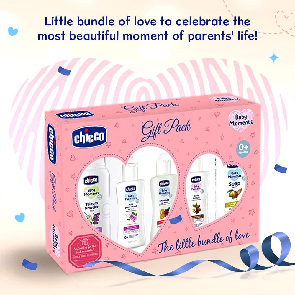 - Chicco baby moments essential gift sets is a perfect gifting kit to celebrate the newborn’s arrival. It includes 5 must-have daily baby care products that are made with advanced formula and contains natural ingredients for nourishing the baby’s skin right from the first usage