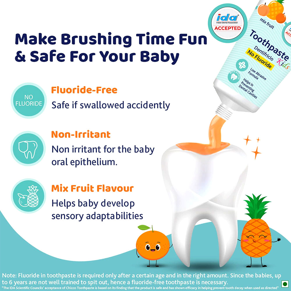 - No fluoride formula fluoride is required only after a certain age and in right amount. Since babies are not yet trained to spit out excess fluoride intake may lead to fluorisis. Chicco toothpaste range upto 6 years have no fluoride formula.