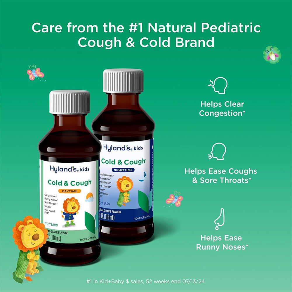 Hyland’s kids cold and cough day and night value pack grape flavored, natural relief of common cold symptoms, 8 ounces. Keeping families healthy: hyland’s is a leading consumer health brand with more than a century of history making high quality products to help people live healthier and happier lives. Made with natural active ingredients, our products contain no artificial flavors or sugars, dyes or parabens. With a state-of-the-art, fda regulated and cgmp compliant facility, our top-selling products are sold in more than 15 countries and can be found in every major retailer in the united states.