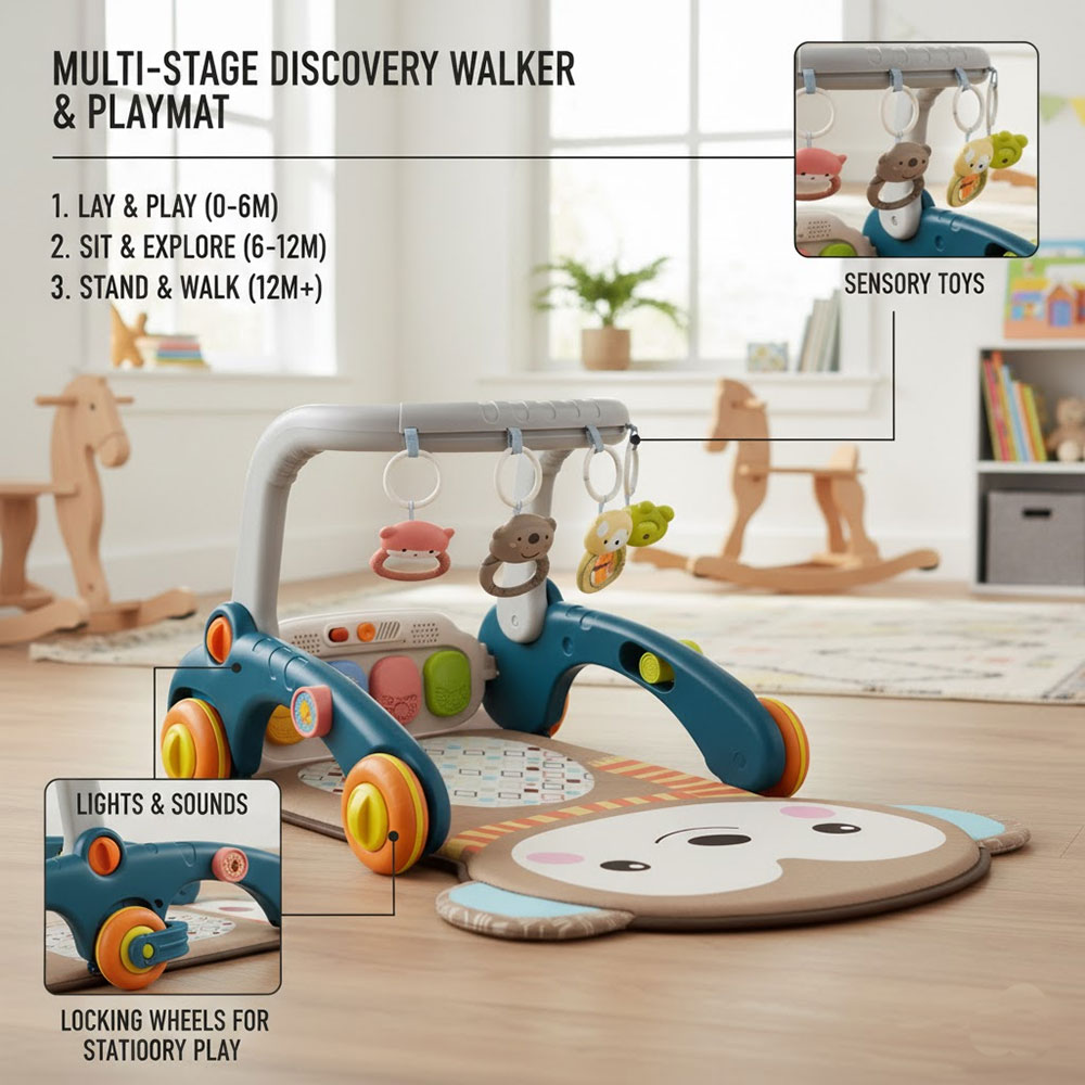 - Musical kick-activated piano: features bright keys that reward baby’s kicks and taps with engaging melodies and sounds, promoting auditory development and strengthening leg muscles.