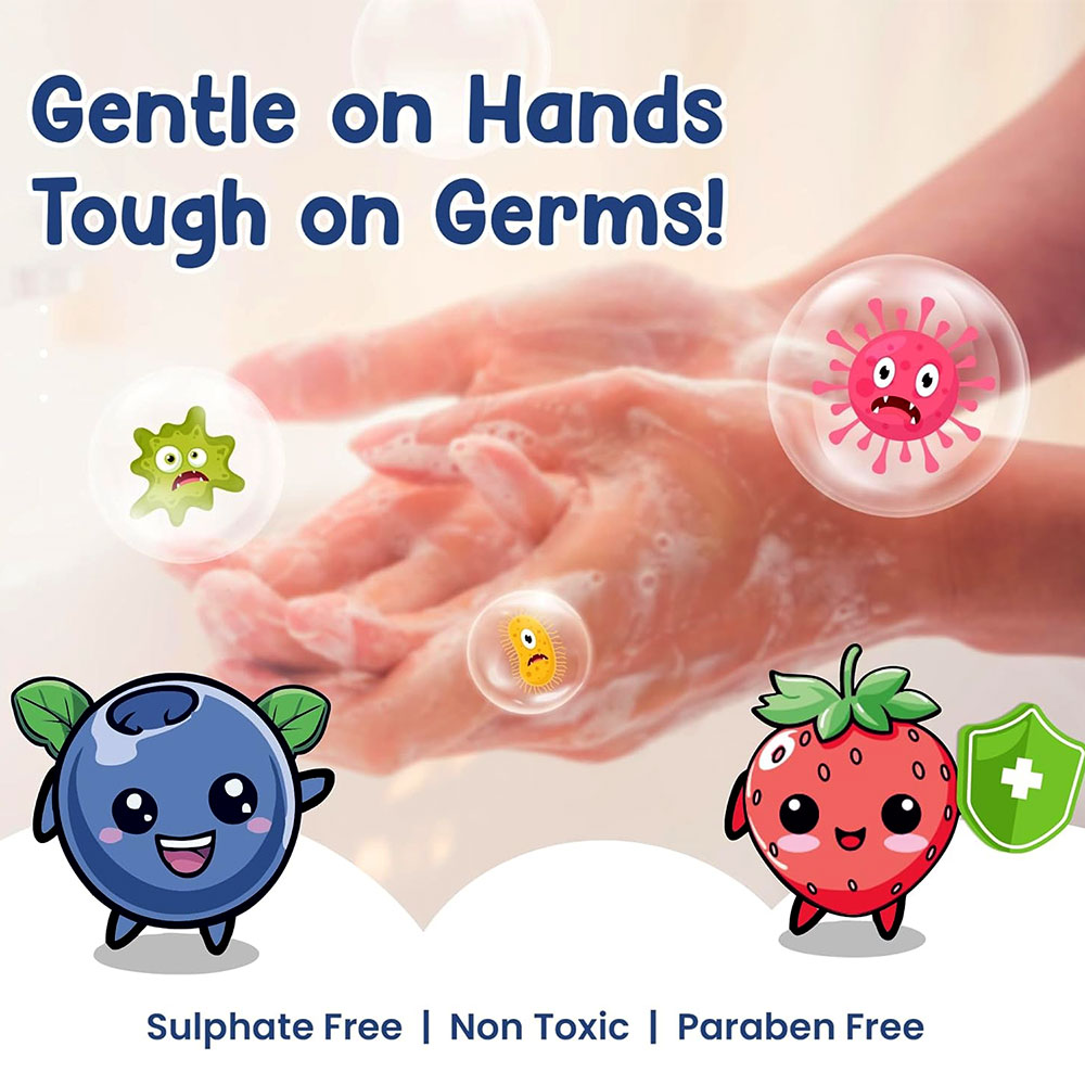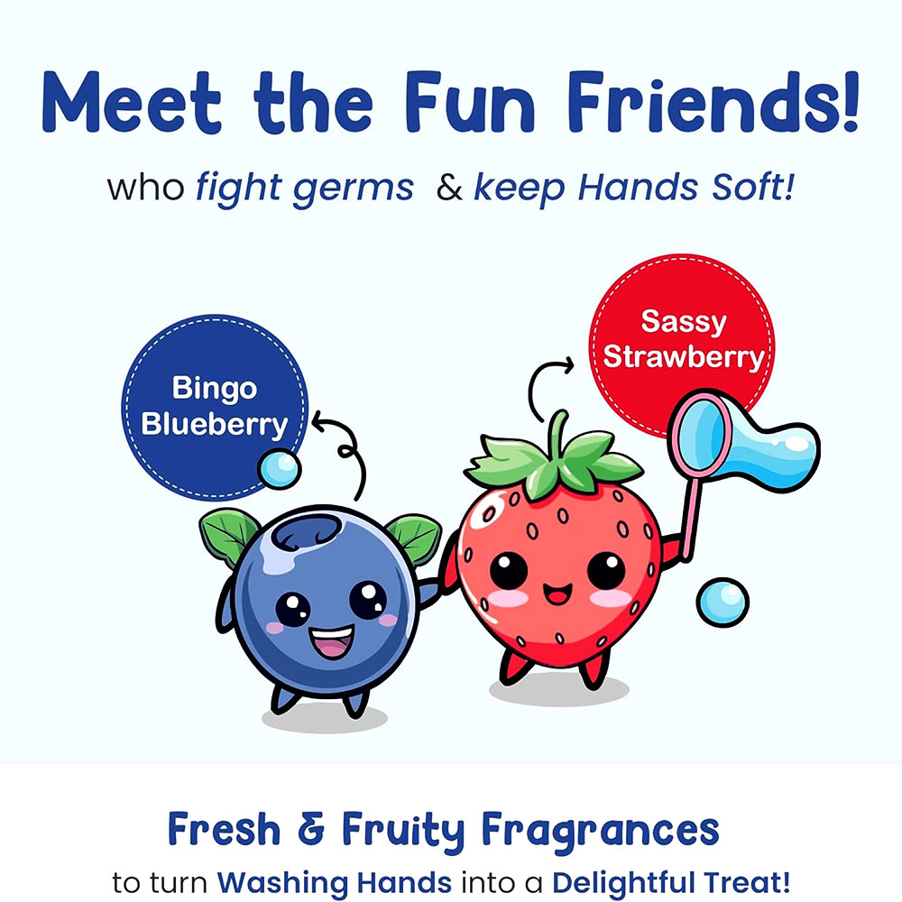 - Meet the fruity friends:- sassy strawberry & bingo blueberry: two delightful characters that make handwashing an action-packed fun adventure! Formulated with naturally derived ingredients and antibacterial properties, they are gentle on hands yet tough on germs.