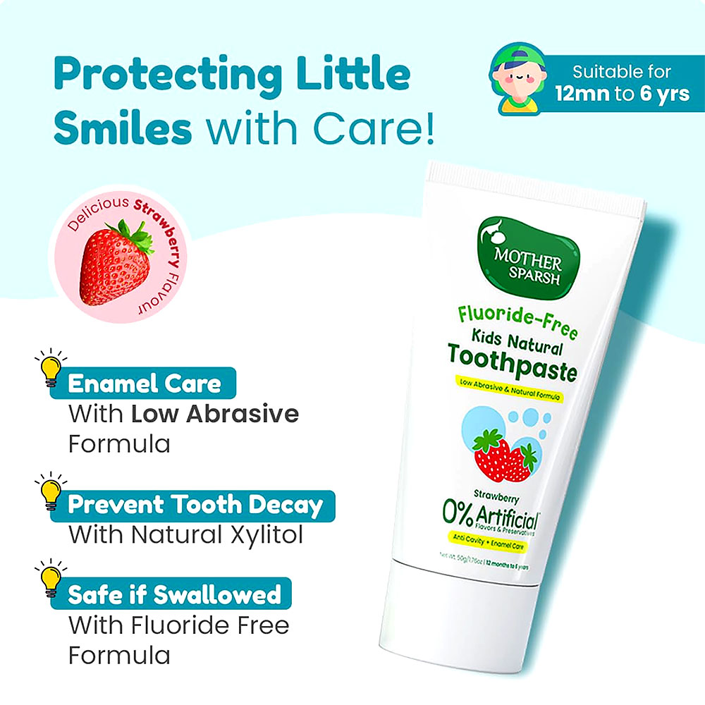 The mother sparsh kids natural toothpaste with toothbrush is an oral care combo specifically formulated for children generally from 12 months up to 6 years. The toothpaste is a low-abrasive, natural formula that focuses on gentle cleaning and cavity protection for milk teeth. Crucially, it is fluoride-free and contains 0% artificial preservatives or sweeteners, making it safe if accidentally swallowed by young children who are still learning to spit. The appealing natural fruit flavor (like strawberry or blueberry) encourages children to adopt healthy brushing habits. The kit includes a child-friendly toothbrush with soft bristles, designed for a gentle and thorough clean on sensitive gums.