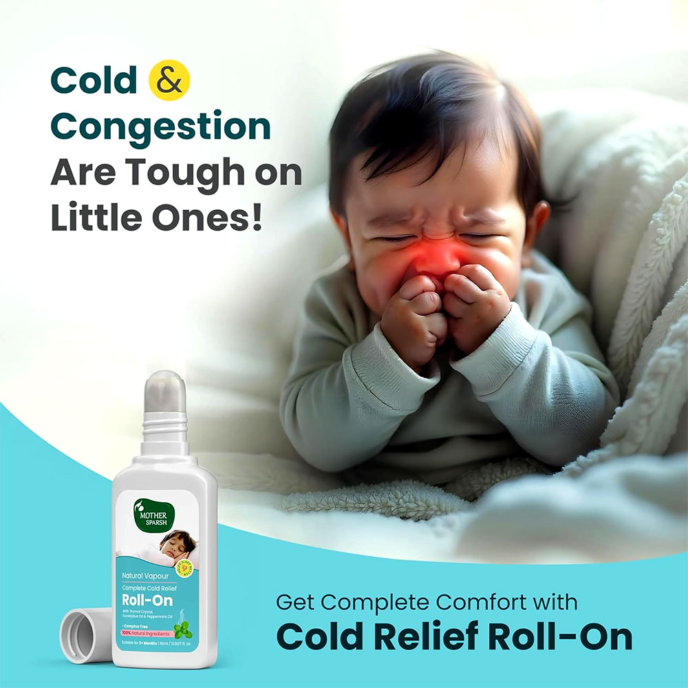 Introducing mother sparsh natural vapour complete cold relief roll-on, a camphor-free, all-natural solution for chest and nasal congestion. Formulated with therapeutic ingredients like eucalyptus, peppermint, and thymol crystal, it provides up to 4 hours of relief for babies over 3 months. This residue-free roll-on is perfect for seasonal allergies and colds, offering instant comfort without harmful ingredients. Easy to use, simply apply to the chest, back, feet, or around the baby’s sleeping area for safe and effective relief.