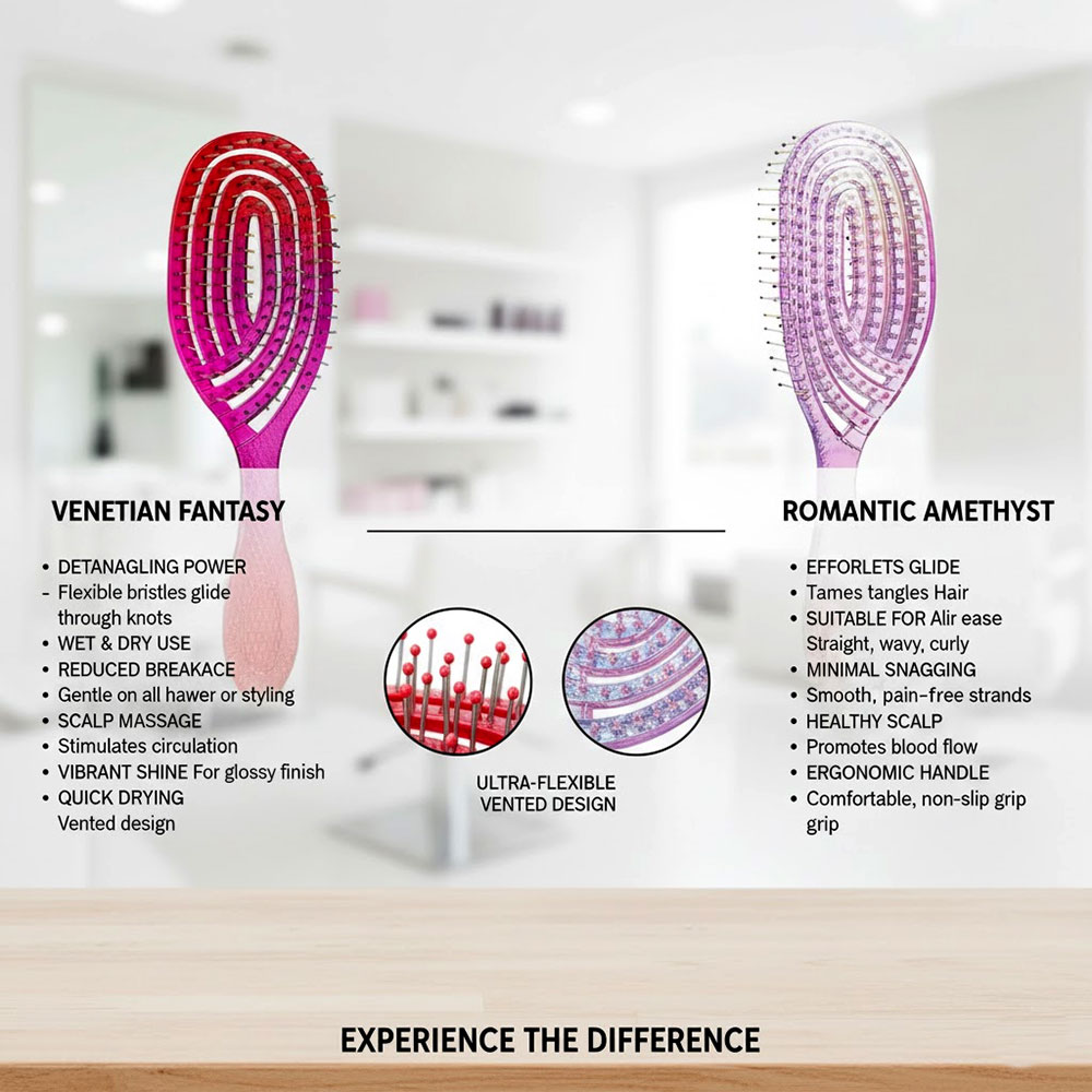 - Ergonomic and colorful design: presented in beautiful, vibrant shades like ‘venetian fantasy’ and ‘romantic amethyst,’ the brush features an ergonomic, non-slip handle for a comfortable grip and a stylish aesthetic that elevates your hair care routine.