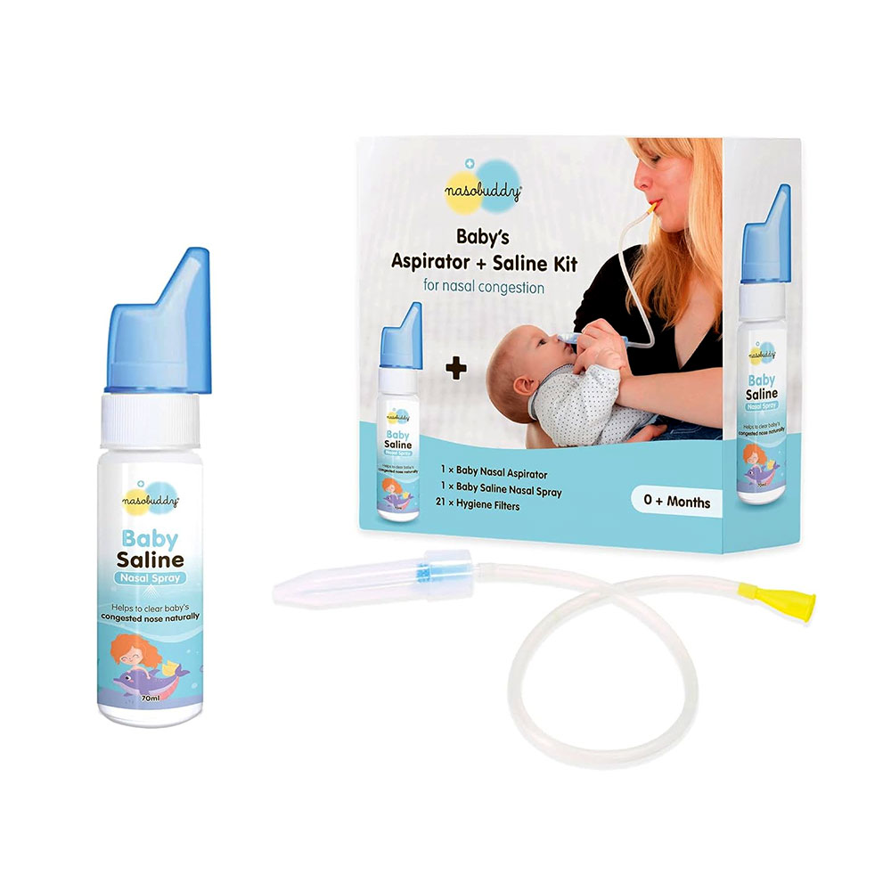 The nasobuddy baby aspirator + saline kit is a doctor-recommended, two-step system designed for the efficient and safe relief of nasal congestion in infants and toddlers (ages 0-5 years). The first step involves using the included saline nasal spray, which is a drug-free, irritant-free solution to loosen and liquefy thick mucus. The second step uses the manual, parent-powered nasal aspirator, which safely extracts the loosened mucus by applying gentle mouth suction. The aspirator’s design is non-invasive and features hygienic filters to completely prevent the transfer of mucus or bacteria from the baby to the parent, ensuring a safe and clean experience.
