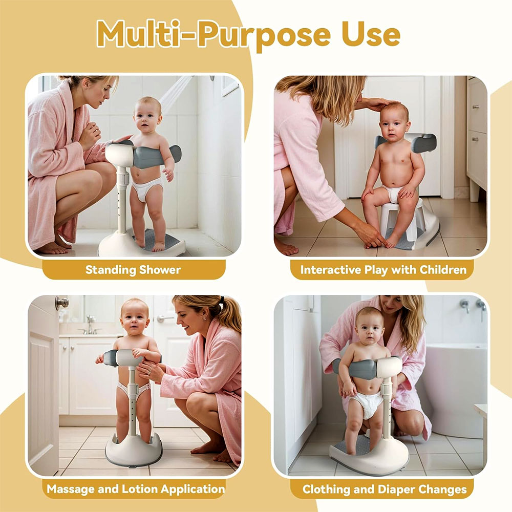 - Multifunctional design: this baby bathtub with stand offers versatile use across various settings. The adjustable armrests of baby standing support securely hold the baby, while the standing shower design adapts to multiple scenarios. It effortlessly meets diverse needs, including bathing, diaper changing, washing face/feet, cleaning the buttocks, and applying skincare products.