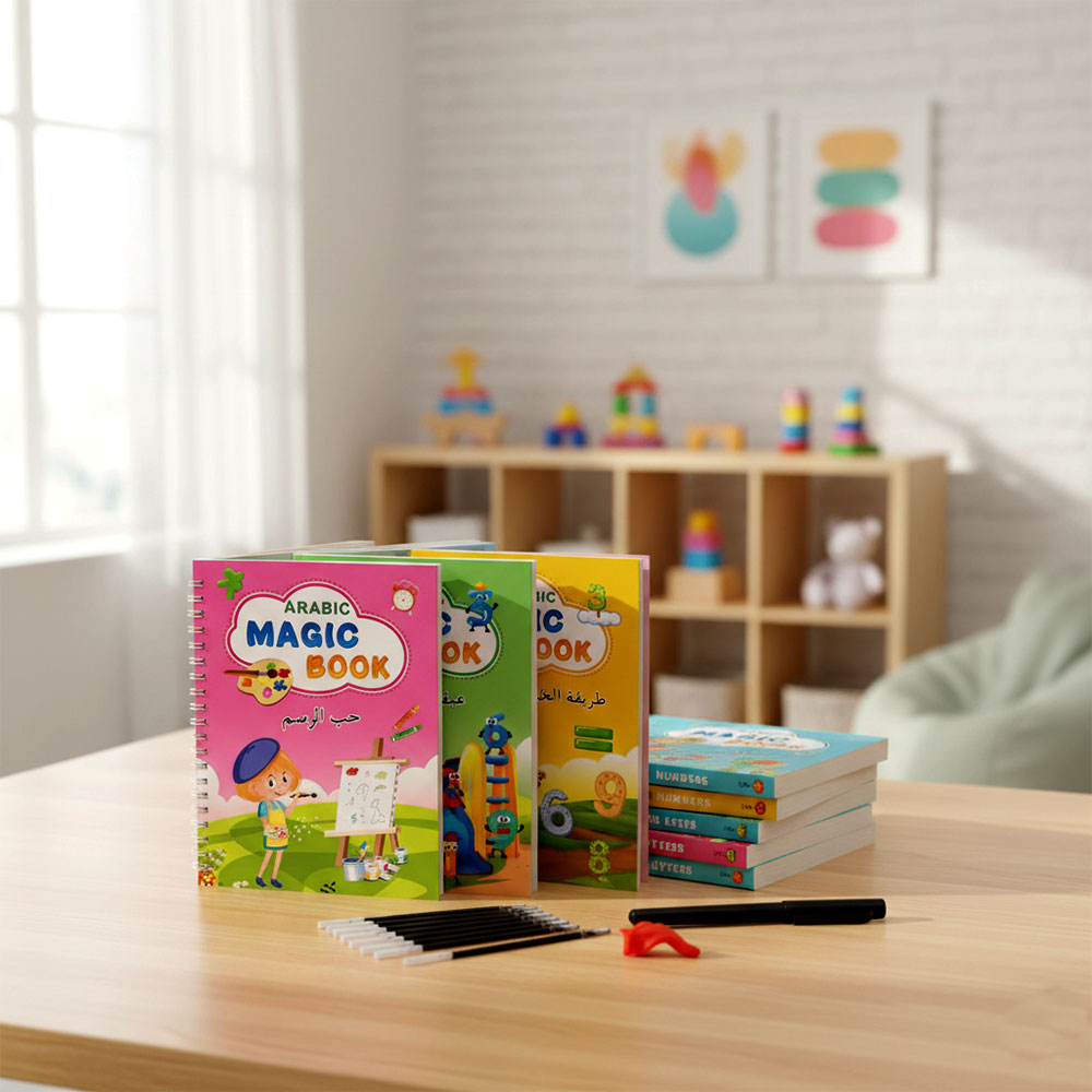 The Sank 4-piece Magic Book is an Innovative, Reusable Writing Tool Designed to Help Young Children Learn to Write Arabic. This Set Includes Four Books Focused on Different Aspects of Handwriting: Letters, Numbers, Drawing, and Mathematics. The Special “Magic” Ink From the Included Pens Disappears After a Few Minutes, Allowing the Books to Be Used Over and Over Again. This Feature Helps Children Practice Without the Fear of Making Mistakes, Building Confidence and Muscle Memory. The Books Feature Grooved Lines That Guide Little Hands, Making It Easier for Them to Trace and Form Correct Strokes.