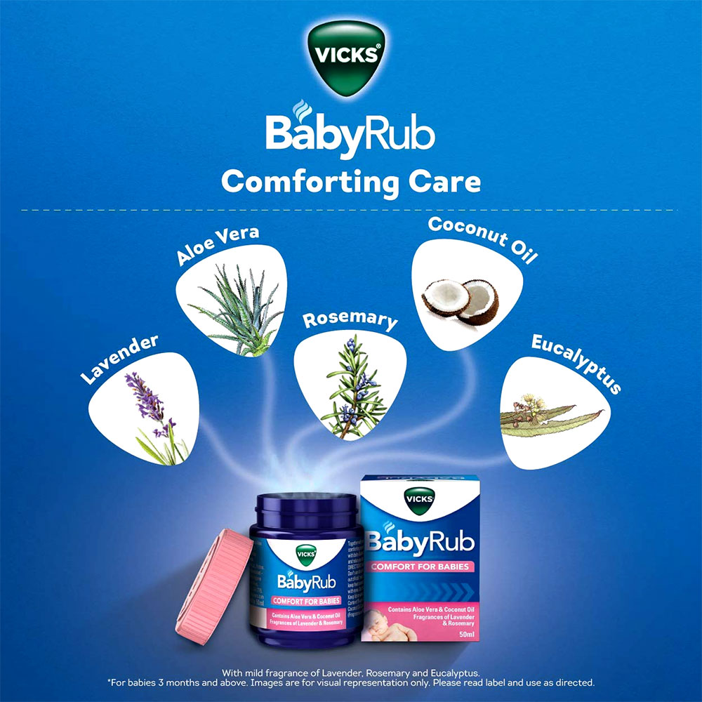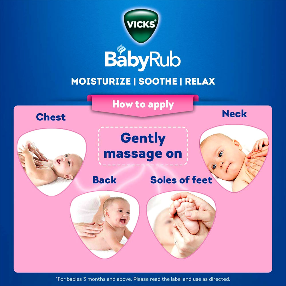 Introducing new vicks babyrub – specially developed for your baby in association with baby and skin experts. It contains aloe vera, coconut oil and fragrances of lavender & rosemary. Together with your loving touch, it helps to gently moisturize, soothe and relax your baby. Suitable for babies 3 months and above. A good babyrub massage can help your baby’s skin retain moisture and stay soft, making your baby feel more comfortable. Directions of use: apply on chest, neck, back and soles of feet for moisturizing and soothing baby care. Specially developed in association with baby and skin experts, vicks babyrub is suitable for babies 3 months and above. It has a long history in usa, canada, australia and new zealand. With millions of packs sold, moms worldwide have trusted vicks babyrub for their babies.